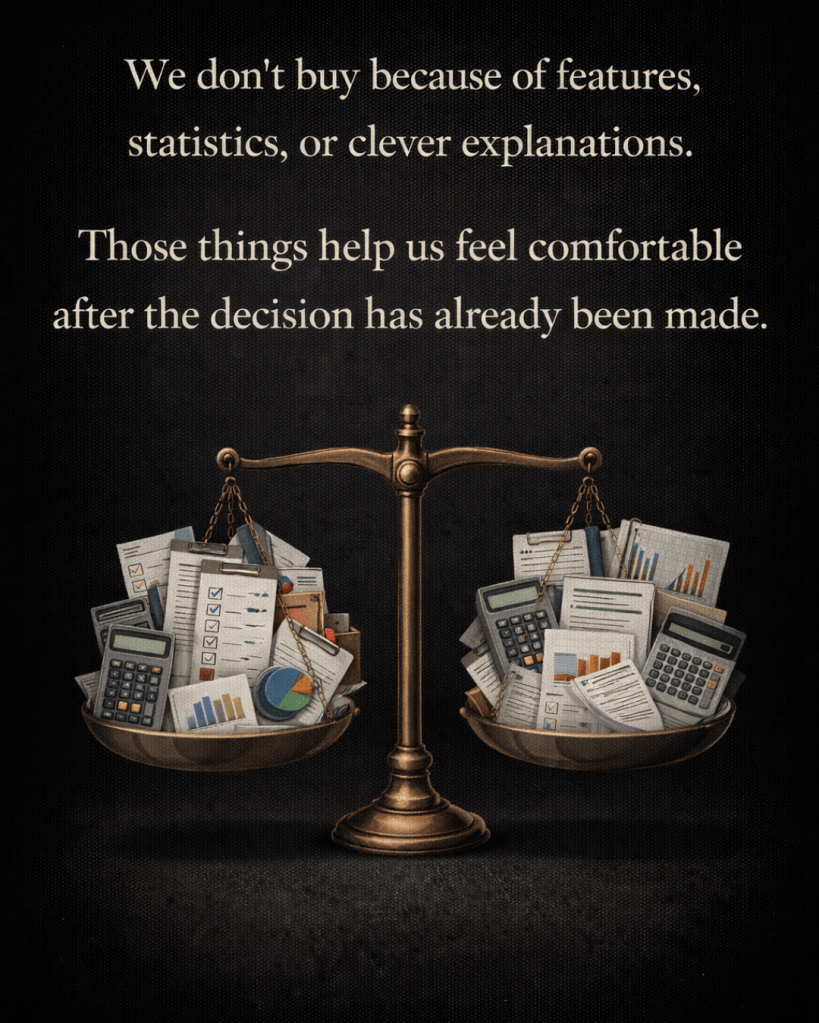 We don’t buy because of features, statistics, or clever explanations. Those things help us feel comfortable after the decision has already been made.